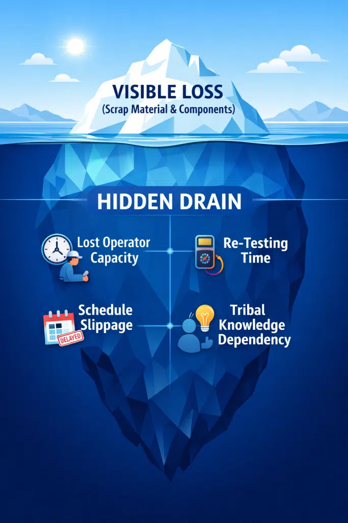 “Infographic: The Hidden Cost of Rework Iceberg. This graphic illustrates that visible manufacturing losses are only a small fraction of the total cost.