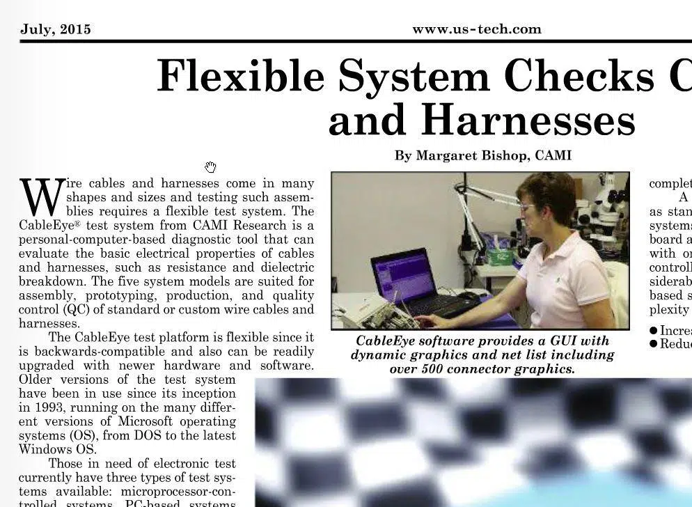 The July issue of US-Tech, One of America’s widest read electronics industry magazines, featured an interesting article by Margaret Bishop of CAMI Research, the subject of which was Cables And Harnesses Checking using a flexible system.